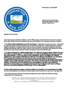 Cliquez sur l’image pour lire la lettre aux élus qui siègent au COmité de PIlotage (COPIL), structure imposée par le directeur de l’ARS. Y siègent : le président du conseil départemental François VANNSON, les députés Christophe NAEGELEN, Stéphane VIRY, (Christophe LEJEUNE), les Maires-Président des conseils de surveillance, Jean HINGRAY, et Michel HEINRICH, les présidents des Commissions Médicale d’Établissement.